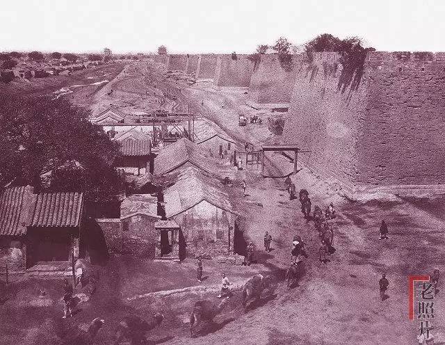 这是一张站在府城东城墙上由北往南拍摄的照片,几位长袍马褂打扮的人在宽阔的城墙顶上悠闲散步。