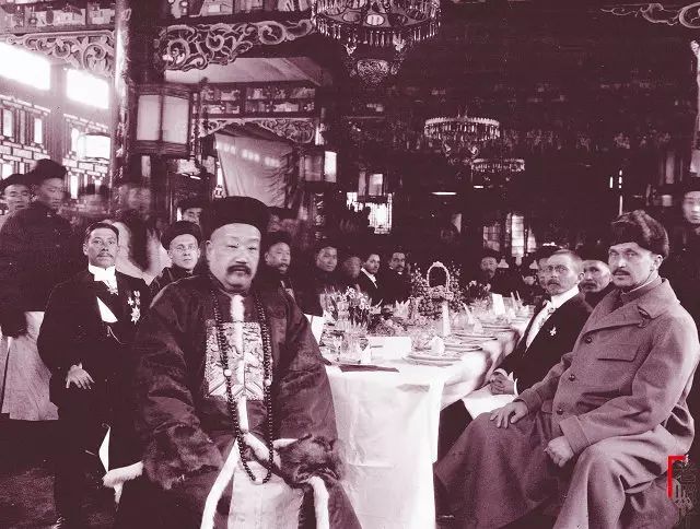 1908年,兰州的一次西餐会,右为荷兰的探险家马达汉,左中为陕甘总督升允。