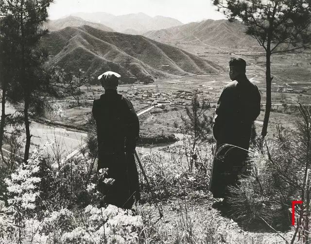 1949年初,蒋介石下野后和家人回到奉化溪口老家。这张照片定格了蒋氏父子在溪口山上眺望故里的情形。
