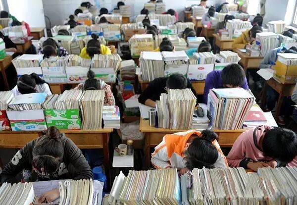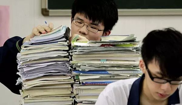 2012年5月9日,广州第三中学某高三班,一学生桌上厚厚的复习资料几乎把他淹没。