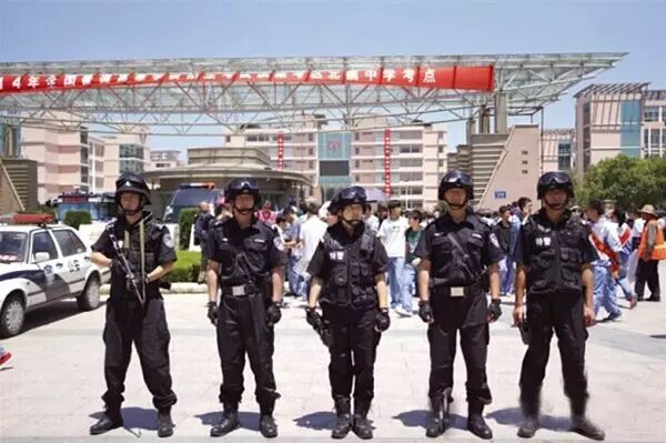 2014年6月7日,山东省滨州市北中考点,黑色制服、头戴防暴头盔、手持冲锋枪的特警负责高考期间安保。