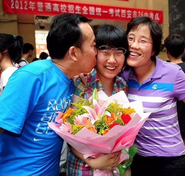 2012年6月8日,高考结束,西安市26中考点外,一位走出考场的考生收到了爸爸妈妈送来的鲜花与深情一吻。