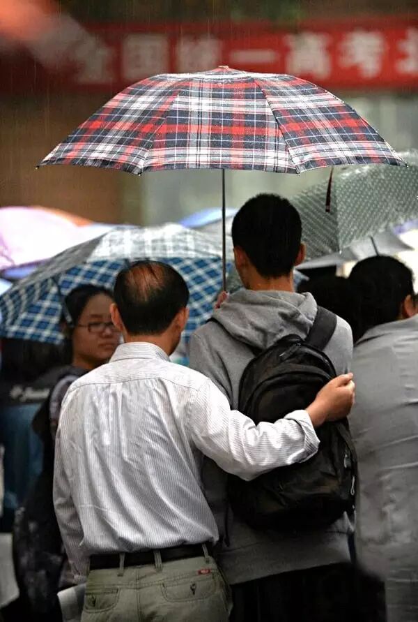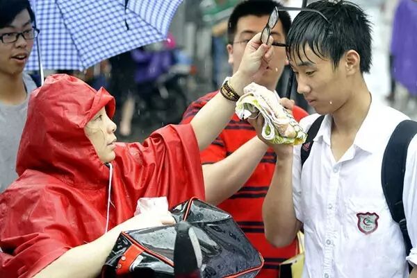 2013年6月7日,宁波市下起了暴雨,宁波四中考点门前,这位母亲在雨中陪伴儿子来考场。