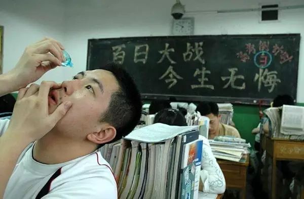 2007年6月4日,山东省烟台一中高三教室里一名学生因复习功课太久眼睛疲劳,滴点眼药水后继续学习。