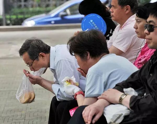 2012年6月7日,在北京西城区一处考点外,等待考生的家长正在吃早点。李文/摄。