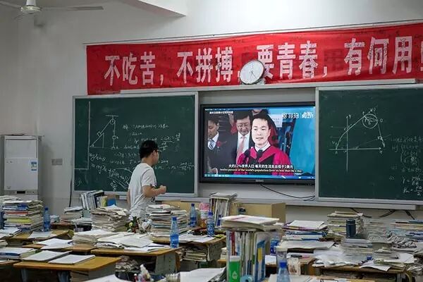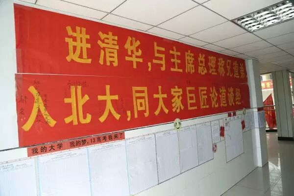 2013年5月10日,河北省衡水二中学校走廊的墙上贴着:“进清华,与主席总理称兄道弟;入北大,同大家巨匠论道谈经”。