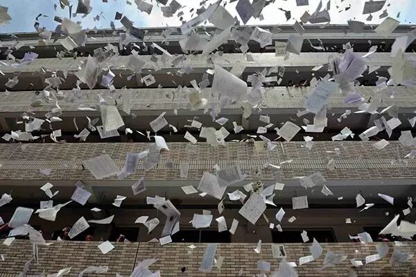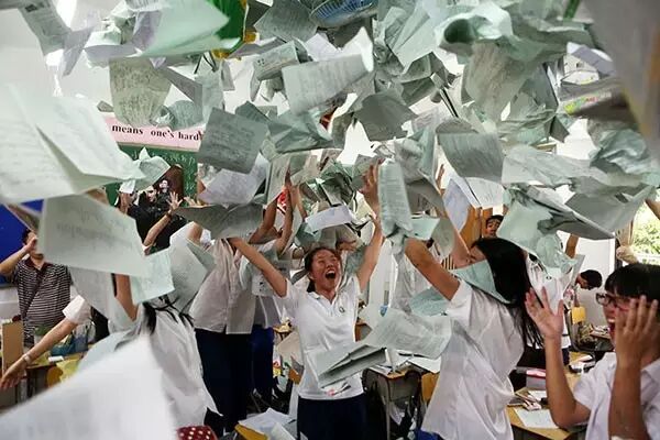 2014年6月8日,广东省东莞中学,高考结束后,高三(9)班的学生将复习资料高高抛起,尽情欢呼“解放”。