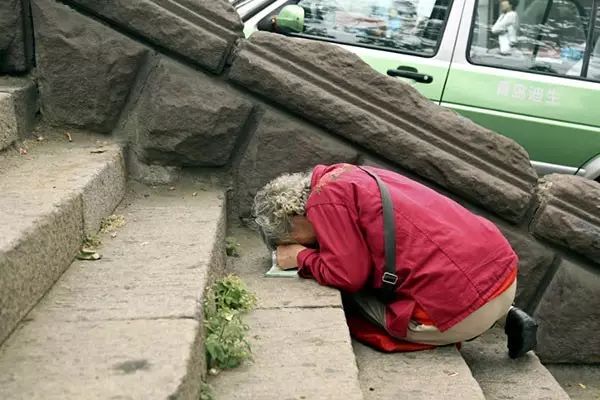 2012年6月7日,山东省青岛市9中门前,72岁的刘奶奶趴在台阶上为正在考试的外孙祈祷。