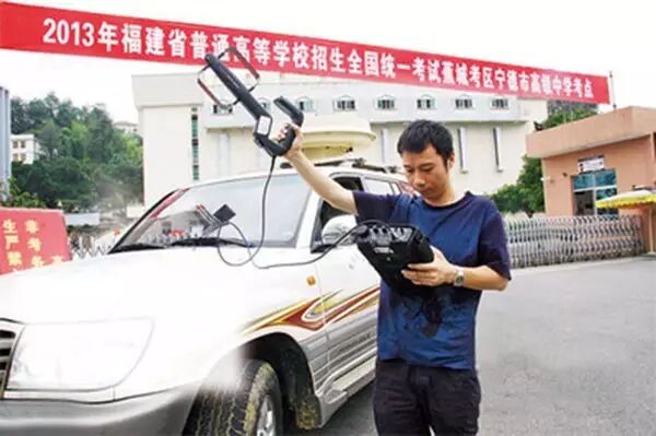 2013年6月7日,福建省宁德市高级中学考点门外,无线电工作人员正监测考场周围有没有无线电信号输入输出,防止考生作弊。