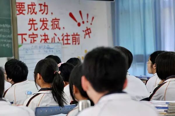 2011年4月13日,厦门市双十中学某教室里挂着“要成功,先发疯,下定决心往前冲”的标语。