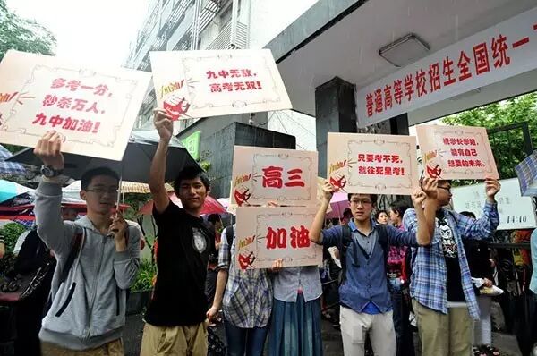 2013年6月7日,南京第九中学考点,准备进场的考生打着各种标语。最左边标语是“多考一分,秒杀万人”,右二“只要考不死,就往死里考”。