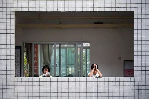 2016年6月3日,湖南省长沙市达材复读中学,两位复读生利用课间休息时间复习功课。