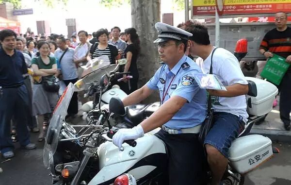 2011年6月7日,郑州市交警支队四大队的一名交警用摩托车送一名忘记带身份证的考生回家取身份证。