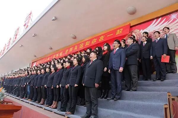 2014年2月26日,河北省衡水二中举办高考百日誓师活动,老师们在台上宣誓备战高考。