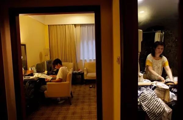 2012年6月6日,上海第一中学附近的一家宾馆,一学生在母亲的陪同下复习迎考。