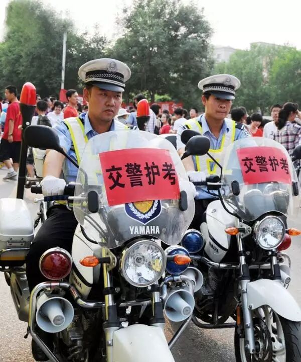 2012年6月7日,河北沧州市,两名执勤民警正在第三中学考点驾驶“交警护考”警用车巡逻,维护交通秩序。