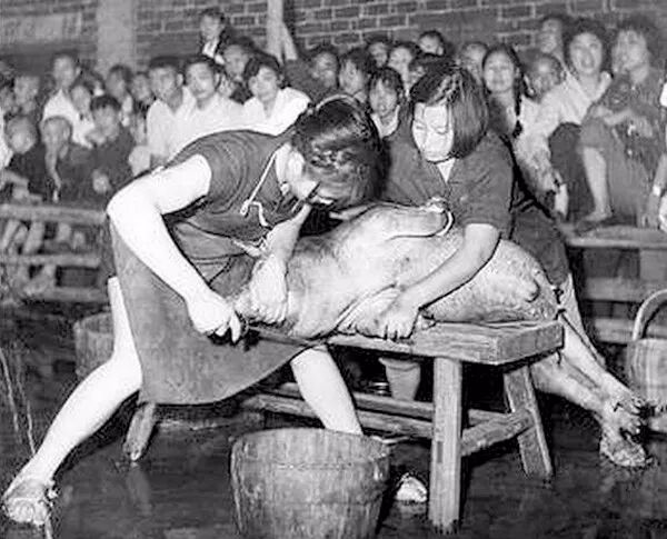 1950年代末,长沙市肉食水产公司年轻的女职工也来学杀猪,而且进行现场表演。