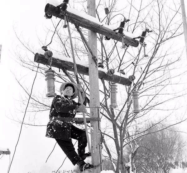 1964年2月25日,长沙,电工冒着严寒维护线路,保证工农业用电。刘振国/摄。