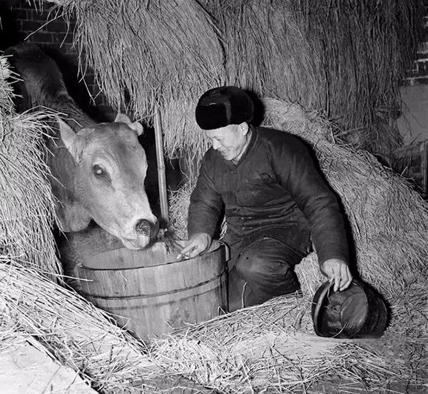 1964年2月23日,长沙市岳麓公社,护牛员在雪天里把牛栏周围用稻草护住,给牛送热水喝。唐大柏/摄。