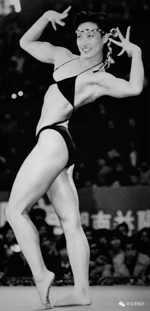 当年的全国健美冠军田卫平穿着"三点式"在省体育馆做表演。