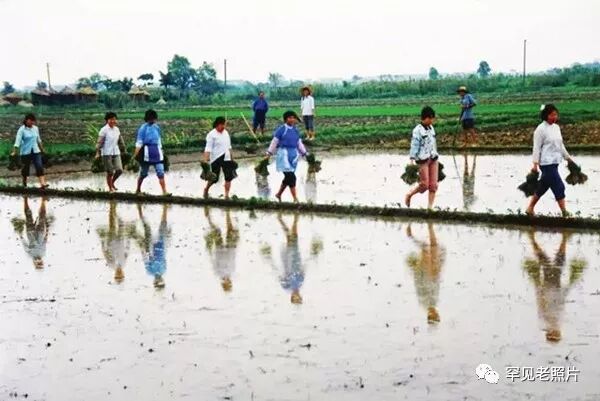 1985年,苏州胜浦镇胜浦村,田埂上的农民准备插秧。马觐伯/摄。