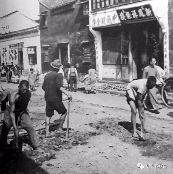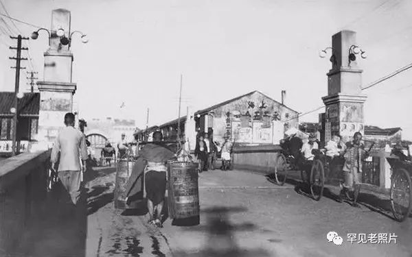 1930年代,苏州新街水泥桥,黄包车夫拉着客人,挑夫担着大桶穿梭而过。