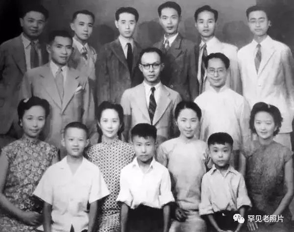 前排左起:周小平(允和子)、沈龙朱、沈虎雏(兆和子),二排左起:元和、允和、兆和、充和;三排左起:顾传玠、周有光、沈从文;四排:宗和、寅和、定和、宇和、寰和、宁和。