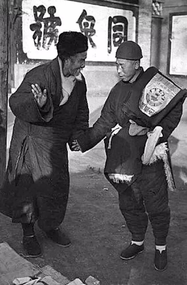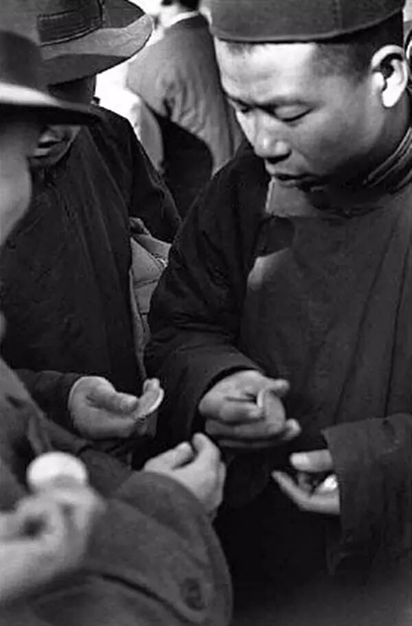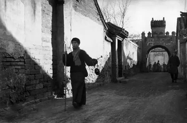1948年12月,北平,街上敲打手锣招待生意的盲人算命先生。
