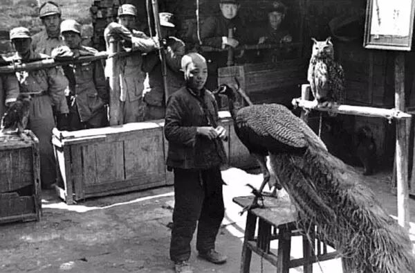 1949年4月,南京,围观孔雀开屏表演的国军士兵。