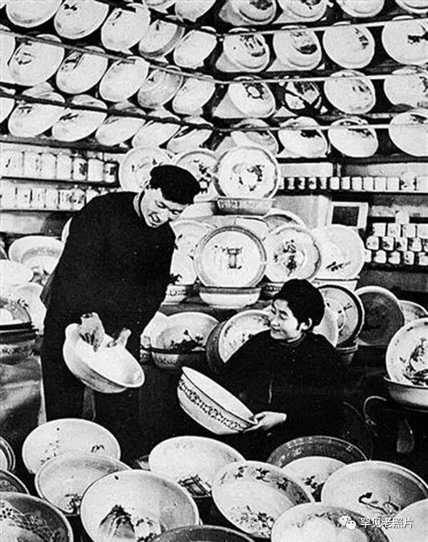 1960年代,大连搪瓷厂库房,两位正在进行质量检查的职工。