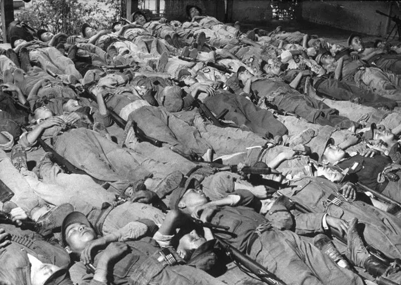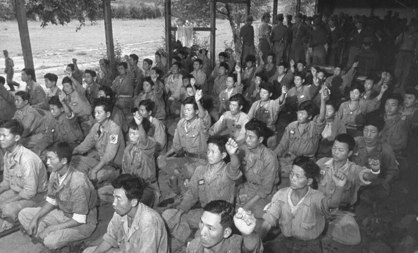 全副武装的南韩警察,在看守草棚里的北朝鲜游击队和他们缴获的27条步枪。