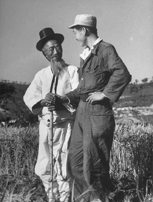 与老农聊天的南韩警察。他负责保卫这一带的稻田。