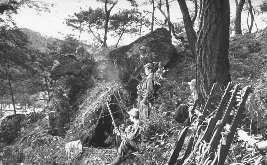 山坡上的南韩警察。他们正在保护山坡下的收割免遭北朝鲜游击队的袭击。