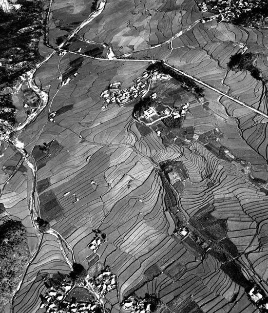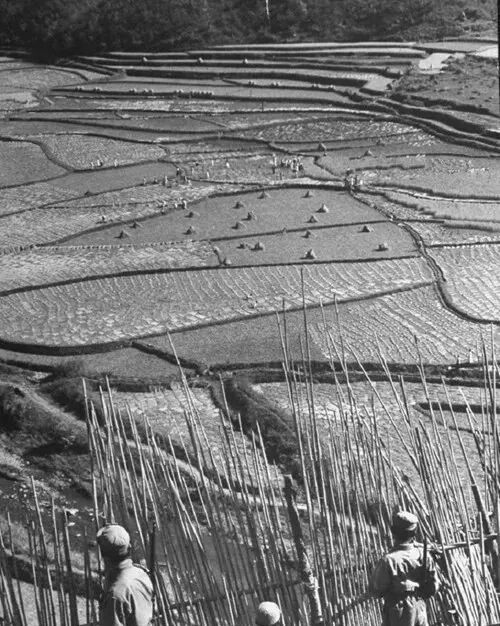 收获中的稻田。来自北朝鲜游击队的袭击,不知道会从附近山区的什么地方突然发生。