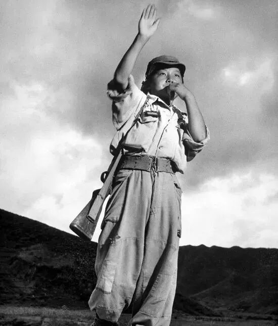 南韩志愿警察,他们正挥舞着一面作为信号使用的白色小旗,严密监视着容易遭受北朝鲜游击队袭击的公路区域。