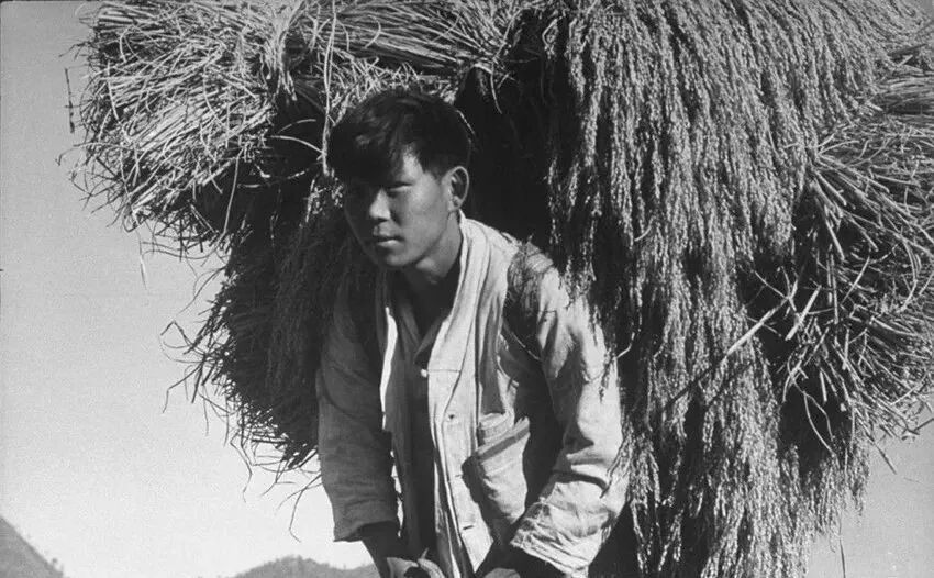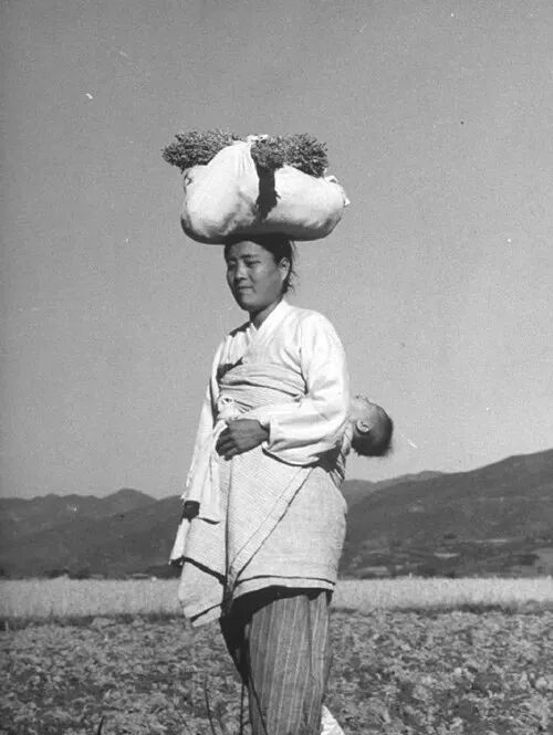 一个背着孩子在地里劳动的南韩农民母亲,她的稻田时刻面临着游击队的袭击威胁。