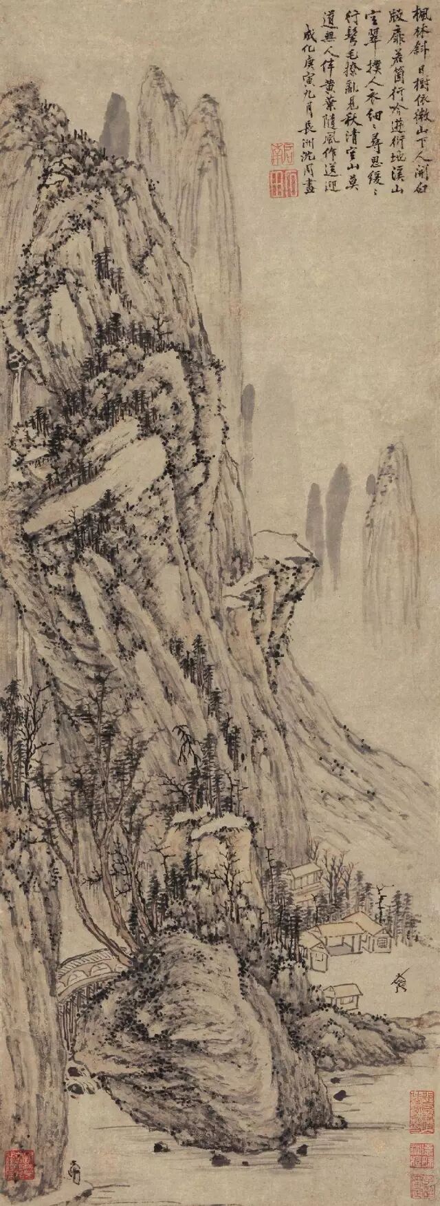 本姓刘,出家为僧后名髡残,字介丘,号石溪、白秃、石道人、残道者、电住道人。湖广武陵(今湖南常德)人。好游名山大川,后寓南京牛首山幽栖寺,与程正揆交往密切。擅画山水,师法王蒙,喜用干笔皴擦,淡墨渲染,间以淡赭作底,布置繁复,苍浑茂密,意境幽深。
