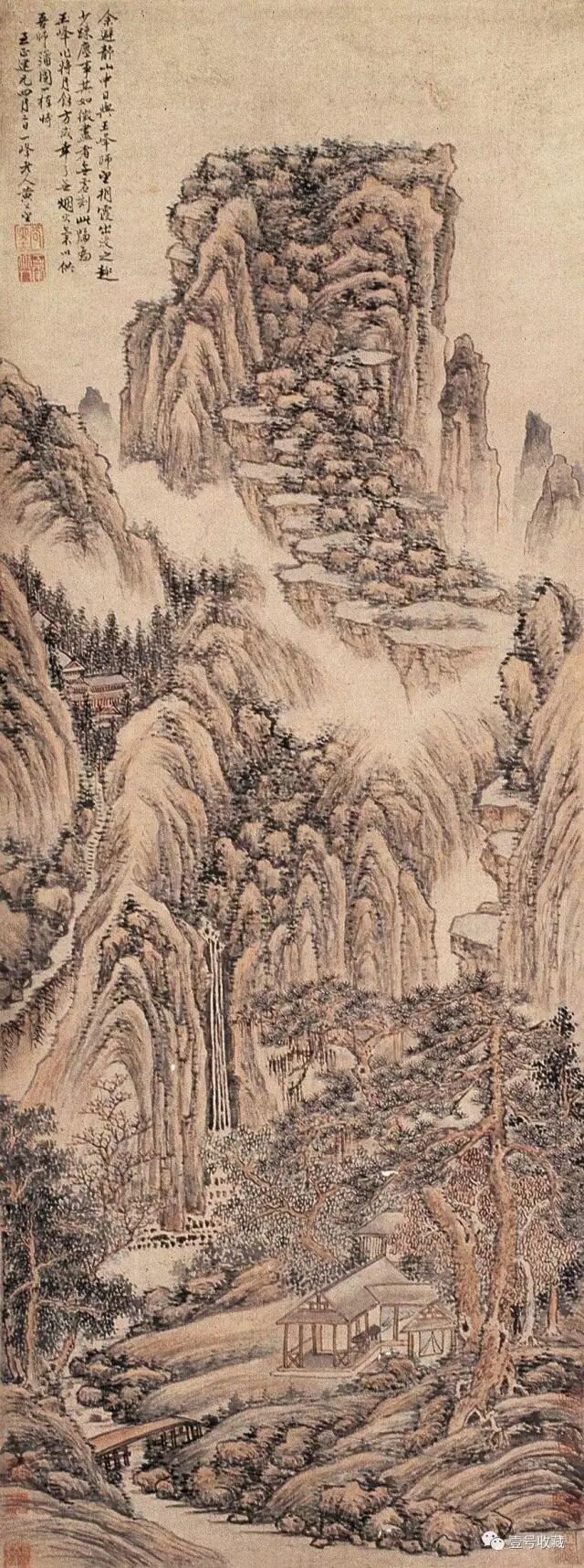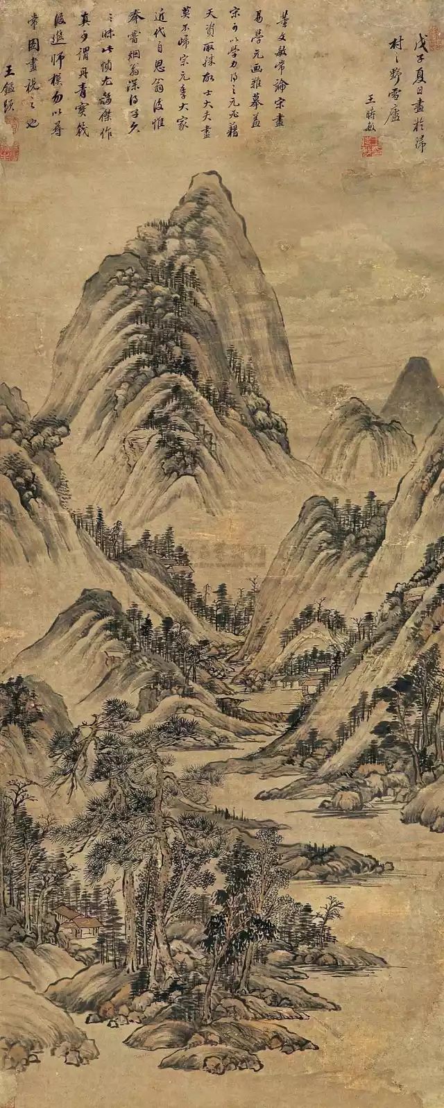字茂京,号麓台、石师道人,江苏太仓人,王时敏孙。康熙九年(1670年)进士,官至户部侍郎,人称王司农。以画供奉内廷,康熙四十四年奉旨与孙岳颁、宋骏业等编《佩文斋书画谱》,五十六年主持绘《万寿盛典图》为康熙帝祝寿。擅画山水,继承家法,学元四家,以黄公望为宗,喜用干笔焦墨,层层皴擦,用笔沉着,自称笔端有金刚杵。