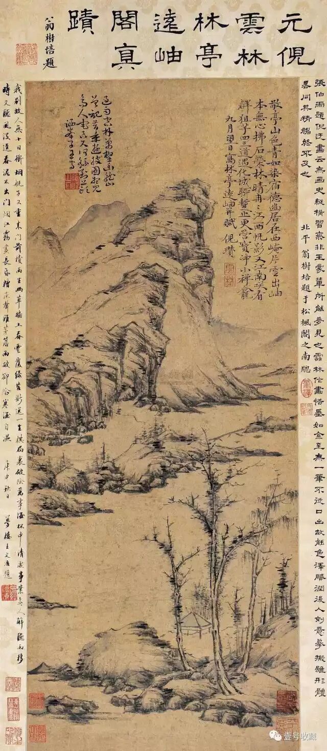 元代画家、诗人。初名珽。字泰宇,后字元镇,号云林居士、云林子,或云林散人,别号荆蛮民、净名居士。倪瓒博学好古,家雄于财,四方名士日至其门。元顺帝至正初忽散家财给亲故,未几兵兴,逃渔舟以免。入明,黄冠野服,混迹编氓。工诗画,画山水意境幽深。