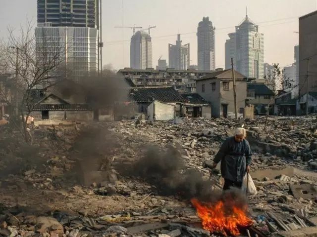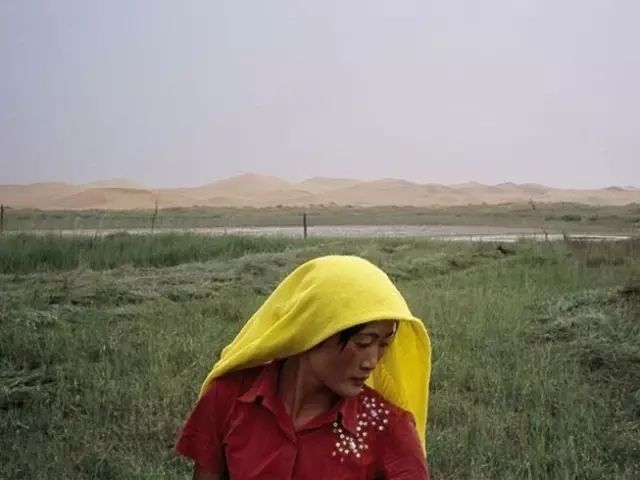 一个穿红色裙子的站在路边吃早餐,不过亮眼的是后面老人