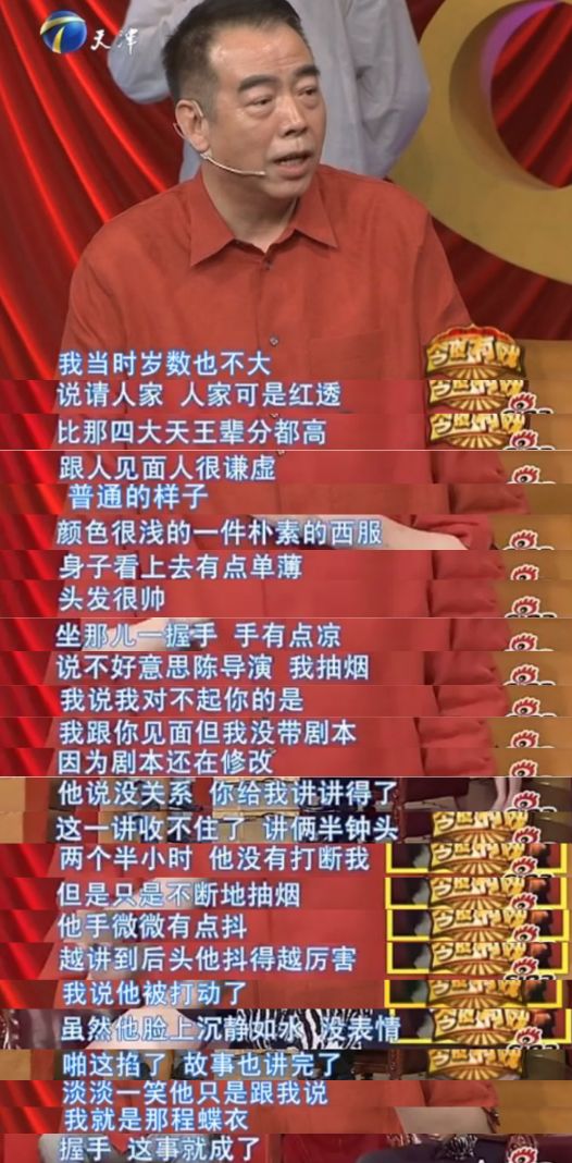 陈凯歌回忆和张国荣第一次见面时,那个时候张国荣刚凭《阿飞正传》拿下了金像奖影帝,和陈凯歌见面时却无比谦虚,听着陈凯歌讲了两个半小时的剧本,说了一句:“我就是那程蝶衣”。