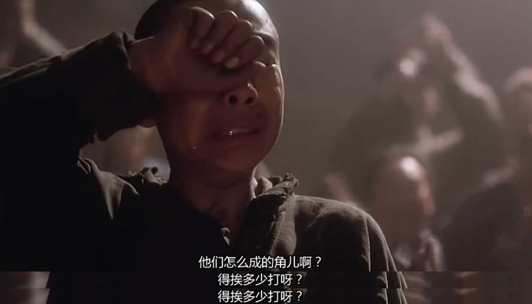 《霸王别姬》里小癞子逃出戏班,看到戏台上一出《霸王别姬》赢得满堂合唱,喃喃道:“他们怎么成的角啊,得挨多少打啊?得挨多少打啊?”