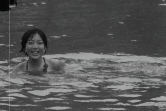 80年代的男女同学们,穿着泳衣,一起在水里打球