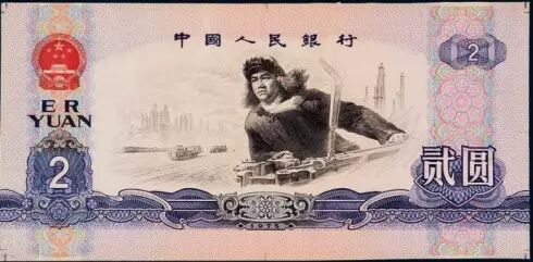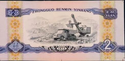 1975年印制的2元纸钞,跟上面的纸钞是同时期,风格也相像,正面是文革时候有名的英模王进喜,而背面则是正在建设中的大庆油田。