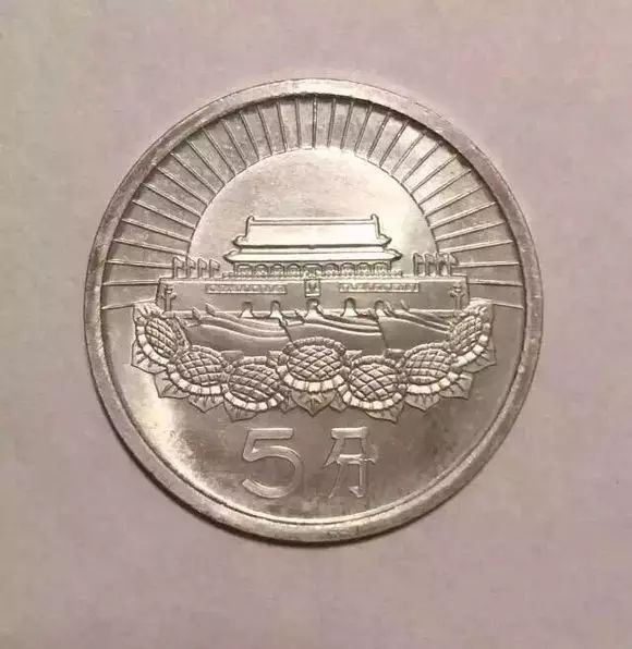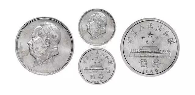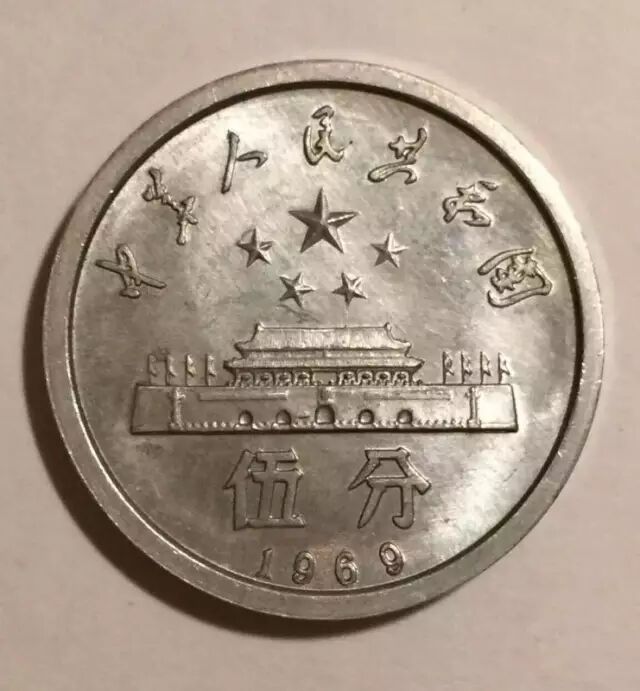 这枚1969年的5分样币没并有官方相关记载,但是也拿出来作为说明,正面是伟大毛主席侧面头像,背面是五星照耀下的天安门城楼。