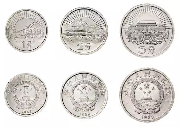 图中的1/2/5分币是在1969年设计的样稿,铝制材料,背面的图案依次为遵义会议遗址、延安宝塔山和天安门。
