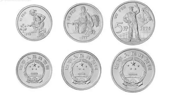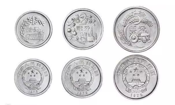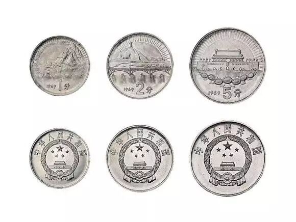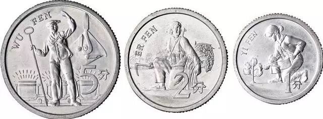 1969年铸造的1/2/5分样币,铝制,从左往右直径分别是24/21/17毫米,图案分比为工人形象的男人、农民形象的女人和学生形象的孩子。