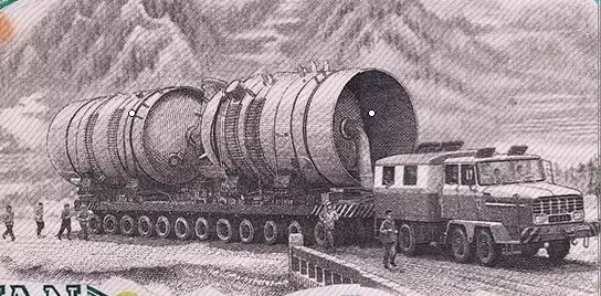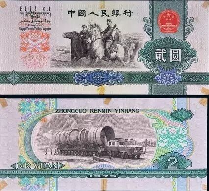 1975年印制的2元样币,此时是文革末期。正面是天山的军民横刀立马的英勇形象,背面则是大型物资运输车。