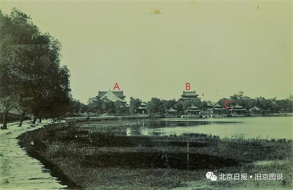 蒂格森拍摄的1902年北海西北岸景观。北海在1900年以前一直是皇家禁地,不准西方摄影师进入,除了1860年比托被批准进入并拍有照片外,至今没有发现其它摄影师在1900年前拍摄过北海。蒂格森拍摄的这张照片属北海较早的影像之一。照片中可以清楚的看到万佛楼(A)、阐福寺大佛殿(B)和五龙亭(C)。A 和B 两组建筑今天均已无存。