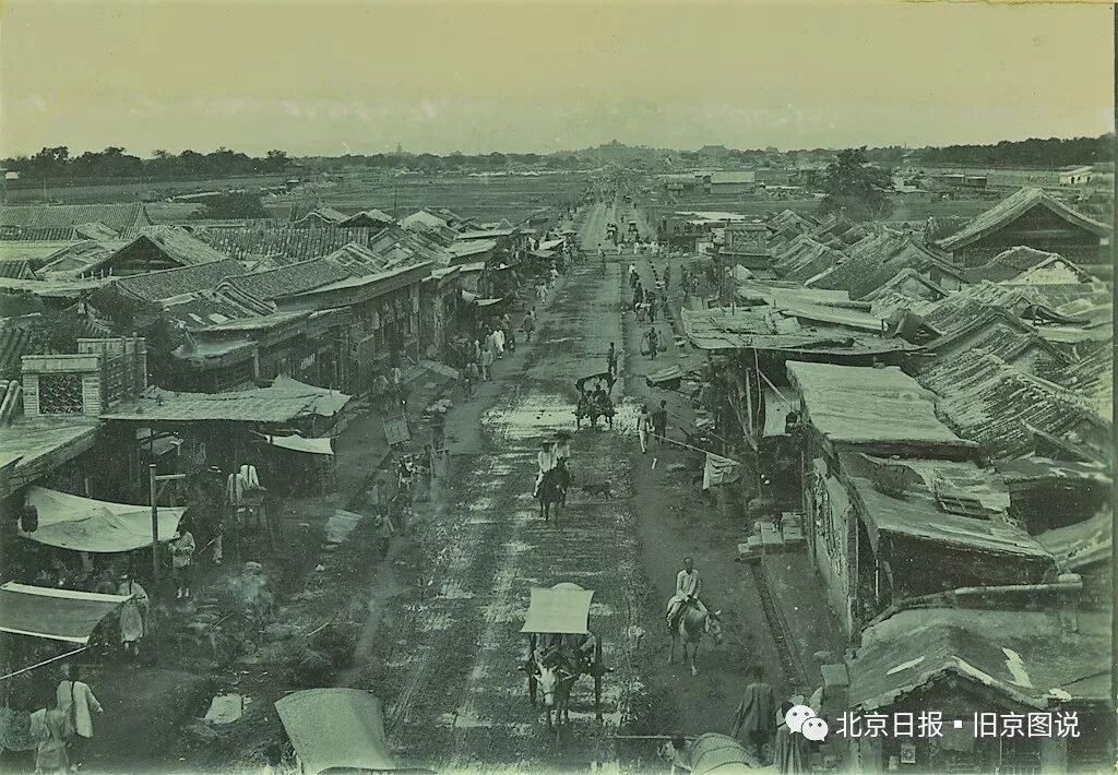 1902 年的永定门内大街,从照片上可以看到远处的景山,照片右上角还能看到永定门内车站,这里是北京中轴线的最南端,也是永定门内最早的影像之一。
